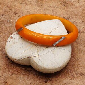 Add a pop of color to your outfit with this vintage bakelite bracelet. The butterscotch orange carved bangle is inlayed with metal strips within four flattened surfaces. The bangle is made from and tested bakelite material and has a beautiful unique and unusual design that will make you stand out from the crowd.