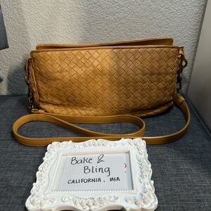 Bottega Veneta intercciato crossbody bag. Has rubs and marks on all four corners of the bag. Interior is clean. Strap is detachable and measures approximately 40inches in length. Made in Intaly. It comes with dust bad and mirror. Has one pocket outside.