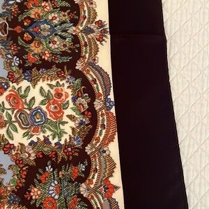 Excellent condition 100% silk scarf from Liberty of London. Detailed floral pattern with wide border. Colors are a beautiful combo of brown, gray-blue, rust, navy blue, green and cream. Would be a lovely fall/winter addition to any coat/outfit. Made in England. Size is approx. 24" x 24" - and can be worn in many ways. Original owner and from a smoke-free home.
