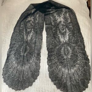 Beautiful antique Victorian era lace shawl. It has scalloped edges and floral motifs throughout. The length is approximately 110".