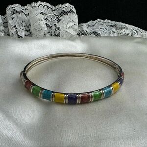 Sterling silver Ross Simons multi color enamel bangle bracelet.marked 925 R and tested.measures 2.8" in diameter.has a push clasp and a safety lock.well made. beautiful in great condition.