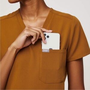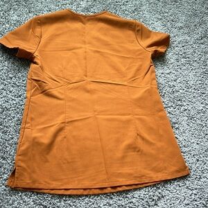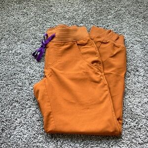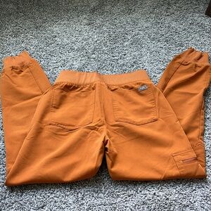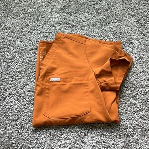 FIGS scrub set. Limited edition Atlantic fall (golden orange color) with petite joggers and top. Top is XXS. Pants are XXS Petite length.