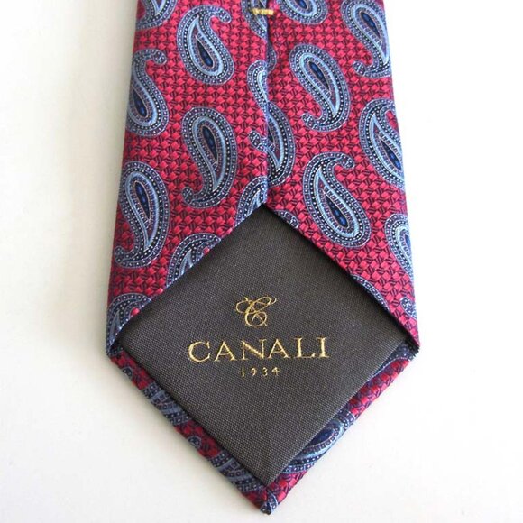 Men's classic CANALI neck tie featuring a pointed tip, an adjustable fit and swirling paisley print throughout. Canali logo on the back. Color: Red/Sky Blue/Blue. Fabric: 100% subtly textured silk. Dry clean only. Made in Italy. Condition: Excellent new without tag.