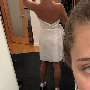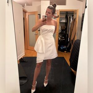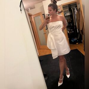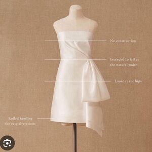 Bought at a bridal shop that was closing and decided to go with a different dress. Size 6, fits a bit like a 6-8 as the top was a bit loose on me and I’m a 4-6. True white color, satin material, and super cute! Feel free to message with any questions. (: I am open to offers as well!