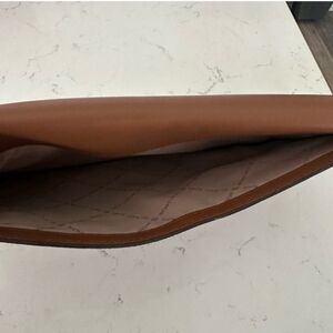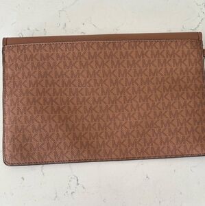 NWOT Michael Kors tan leather clutch. MK logo. Large pocket on back of clutch. Magnetic closure. Interior has MK logo beige fabric lining with one large slide pocket and eight credit card slots. Excellent condition never used. Size 12" x 8".