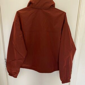 Relaxed fit, cropped length. Can be worn with a hood or not. Drawstring at waist. Button and Velcro closure. Early fall or springtime jacket or use as a layering piece.