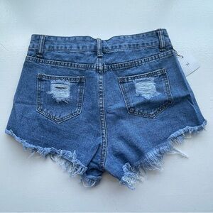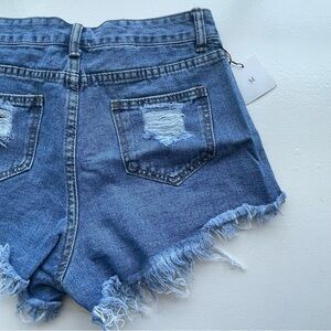 High rise, distressed, raw hem blue jean shorts. These are so cute and sexy! Perfect for summer😎
