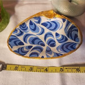 This shell is 5 inches by 4 inches. The colors are different shades of blues on a white background. I glazed the the shell with 2 types of glaze, front and back. Adding a gold handpainted edge.