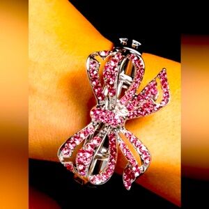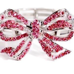Infused along elastic stretchy bands, airy silver frames gleam along the wrist for a monochromatic display. Encrusted in light rose rhinestones, an oversized, airy silver bow glitters at the center of the design for a touch of class and refinement.