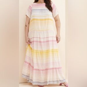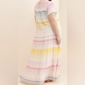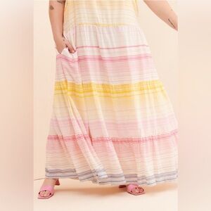 So whether your look is city boho or country chic this feminine striped tired maxi will be your versatile go to dress all year long. Super lightweight fabric & soft colorful pastel rainbow striping throughout w/double pockets & keyhole back w/button closure. Pair with jean jacket & sandals, wedges or cowgirl boots & you’ll be a show stopper for sure.