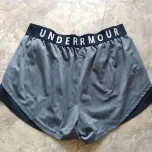 Soft, lightweight knit construction offers superior comfort & breathability. Material wicks sweat & dries fast. Anti-pill/anti-pick finish adds extra durability, exposed elastic printed waistband, convenient side pockets and curved hem for a more flattering silhouette.....the perfect go-to shorts in great color combination of gray & black. Pre-owned in excellent condition.