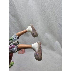 Flaws include- pants are very stained , top has some discoloration and a small hole, robe has some pilling and stains, shoes have felt wear and tear and lots of discoloration and stains, frog Toy has some felt wear and discoloration, earring have paint chips.