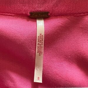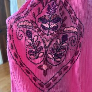 Beautiful pink skirt and top set. Top has hook and eye closure and faux wrap design. Top front and back are lined, sleeves are sheer. Skirt is lined and has back zipper. No flaws or stains. Embroidery is all intact.