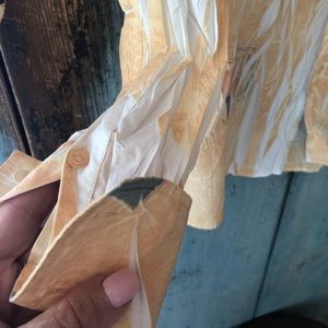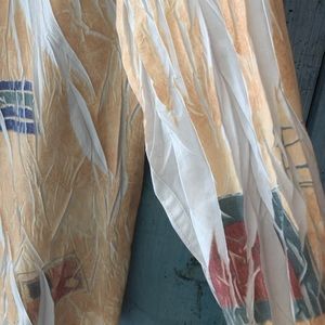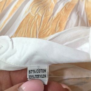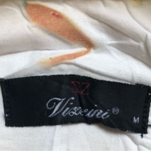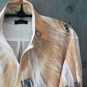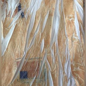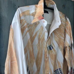 This shirt is so unique it’s rather hard to properly describe! The fabric is 67% cotton and 33% terylen and was “crinkled” before it was dyed leaving portions undyed and white. The main color is a beautiful deep golden yellow and then there are scattered designs of green, blue, and terracotta throughout. The designer is Vissini from Italy, but the shirt was actually made in Turkey. It looks and feels very sexy on! Just turn the cuffs and collar up for a sophisticated and very attractive look. The measurements are: “Pit-to-Pit” = 20” and stretches to 22” if wrinkles are expanded; Length = 29” The size marked is Medium and the fit is like a 10/12. You won’t see another like this as the designer is no longer producing. You will receive many compliments, however! Please let me know what questions you may have.
