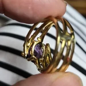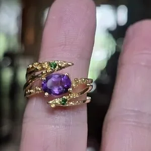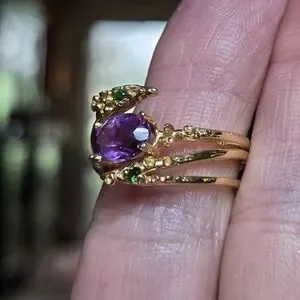 This is a NEW ring fresh from my jewelers studio for my Natural Edge Kharma Collection 2024. This unique stunner is an all natural amethyst set in solid 925 sterling silver dipped in 24k gold with crisp green chrome diopside accent stones. This gold stays put! Please ask questions and make an offer. I can't say yes if you don't ask!