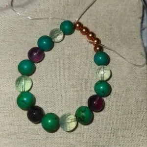9 mm ceramic and faceted glass beads with accented 6mm raw copper beads. Durable stretch cord.