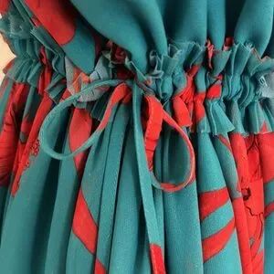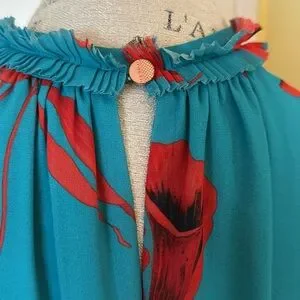 - raw-edge ruffle detail on neck, sleeves, waist