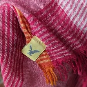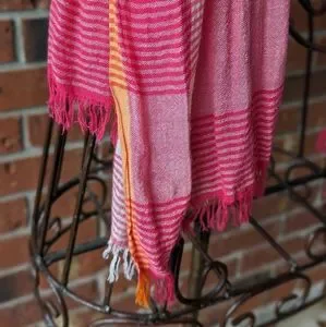 American Eagle Scarf in Striped Buffalo Plaid hues of pink, orange, and white. This casual scarf measures 30" x 81" and is in good used condition.