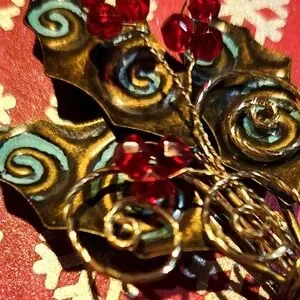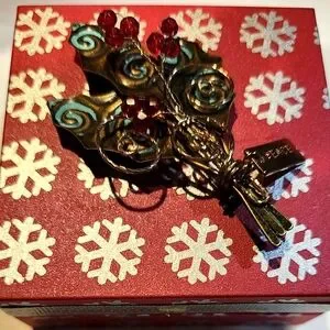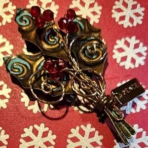 Merry and Bright Christmas, Brooch. Very pretty in person made with silver and gold tones with red beads and painted turquoise color design with a charm that says peace. comes in red box with silver snow flakes.