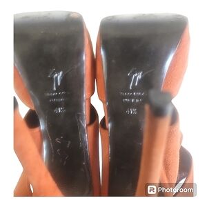 These Beautiful Sexy Guiseppe Zanotti Suede Heels are waiting for you. The shoes are more of a burnt orange rather than orange. These shoes are pre loved with signs of wear on the soles. The heel is 6.5 inches tall, and the platform portion in the front is 1.5 inches.