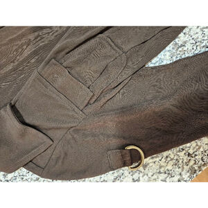 This is a pre-owned Diane von Furstenberg wrap dress in size 2. It is a dark brown color and features a V-neckline, a collar, and a tie belt. The dress has two pockets on the front and two decorative rings on the sleeves. The dress is made of a soft, stretchy fabric and is in good condition. There are no visible tears or stains. The dress is approximately 38 inches long from shoulder to hem.