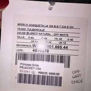 PRONOVIAS off white Jacket only NWT Size 12. Runs small.