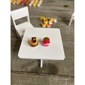 A beautifully crafted miniature set of assorted fruit tarts and dessert pieces, perfect for dollhouses or dioramas. Each piece features intricate detailing.