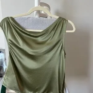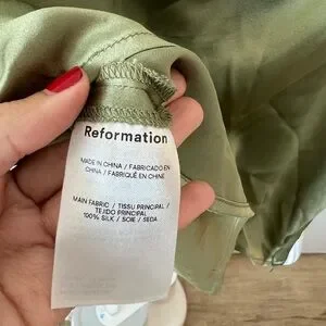Annika Silk Top from Reformation featuring light olive green, silk, draped design, asymmetric design, seam detailing, one-shoulder, adjustable fit and straight hem. Conscious: We've partnered with Good On You – an ethical agency that rates how sustainably brands perform.