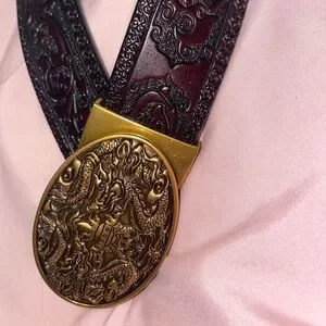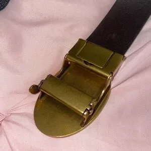 Brown clip belt with gold buckle. The belt locks in place. Worn one for a musical.