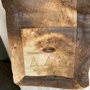 Stunning HANDMADE boho bag from Colleen Cordero! Absolutely beautiful patchwork leather with gold detailing and subtle green/ red embroidery. Has a wooden fastener and a thick strap that is long enough to be worn on the shoulder or across the body. The texture is buttery soft-- I believe it's deerskin. Double pocket inside.