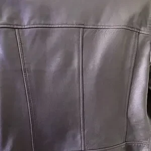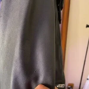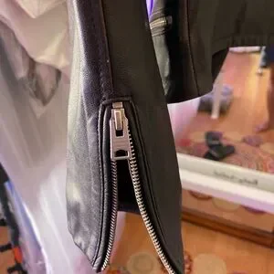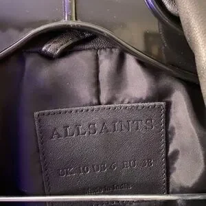 AllSaints Bales Biker Jacket 100% lamb leather. Lining 100% poly. Used. Worn about four times, but has some flaws on the right sleeve that are not too noticeable. Leather has not been treated or safeguarded with anything, so might consider doing that when purchased .. probably why I found a few flaws on the sleeve that I didn’t know how they got there. Maybe some rain had gotten on it to create the kind of discolored flaw and the two tiny ones looks like I may have scratched the sleeve up against something. Feel feel to reach out with any other questions ;)