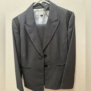 Gray Tahari suit in size 6. Jacket and pants included. Nice leather detailing on the shoulders. Timeless style. Great condition! Only worn a few times.