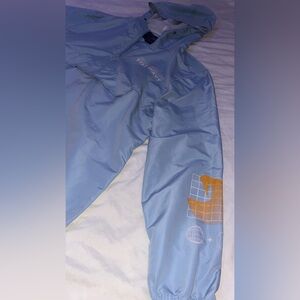 This light blue windbreaker jacket is perfect for any season. With a quarter zip closure and see-through fabric, it's great for layering over your favorite outfit. The jacket features a unique see photos for specific details neckline and long sleeves with the Brooklyn Cloth logo accents.