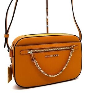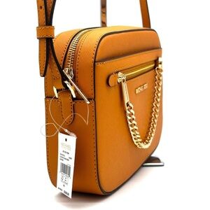 Inside: 1 large padded pocket, & 1 slip pockets MK Signature fabric lining 10"(L) × 6.5"(H) x 2"(D) adjustable 22" chains & leather crossbody strap This is an outlet style