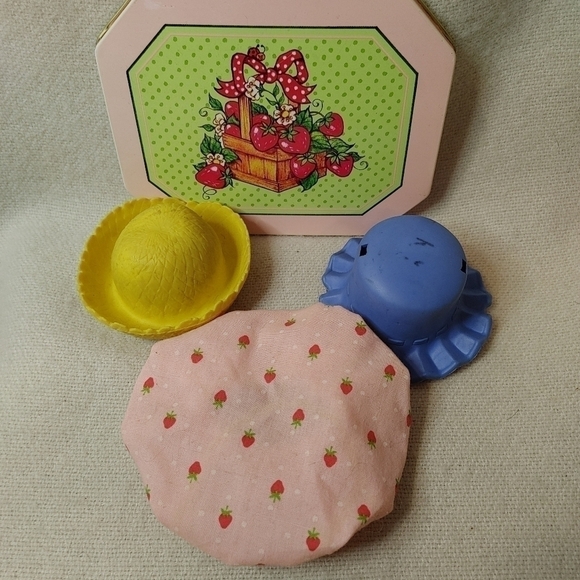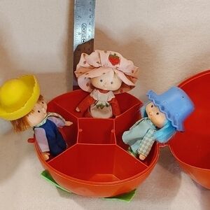 Also included a vintage Strawberry Shortcake metal tin and giant strawberry carrying case. Both show wear and scratches, strawberry clasp on large strawberry sticks out a bit.