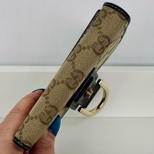 Stay organised in style with this Abbey D Ring compact wallet from Gucci. It is crafted from GG canvas and it comes in lovely beige and metallic gold hues. It has the D ring motif on the front. The wallet features a coin compartment and the snap button (back coin snap is loose but still snaps close) reveals multiple card slots and compartments for cash.