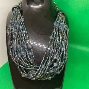 Beautiful beaded blue necklace. Goes with anything, dress up or down. Necklace is 10 inches in length. Very nice statement piece. Very pretty iridescent beads