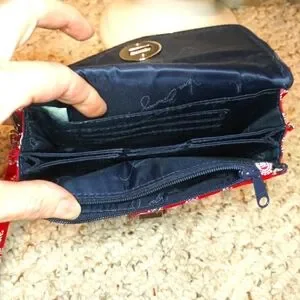 EUC Very lightly used, vintage petite turnlock wallet in a red, white and navy paisley bandana print, from Vera Bradley. Wallet has clip on wrist strap, signature navy lining, four pockets with three card pockets, and large zippered coin pocket. Please see all photos.