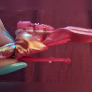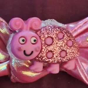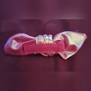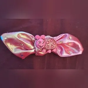 cute handmade barrett for the hair. pink and shiny little caterpillar on a shine pink bow it little diamond like spots. small clip on back to clip on. could clip on shirt like a bow tie as well