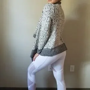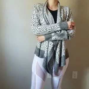 Gently worn blanket cardigan with a fun gray and white design