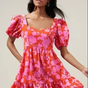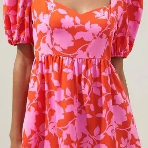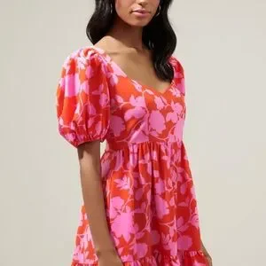 Sugarlips Pink and Cherry Red Puff Sleeve Floral Ruffle Hem Mini Dres