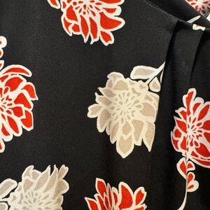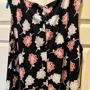 Perfect shell. Size 3x is 30 inches "pit to pit" with some spandex. Sleeveless modestly cut top with black background and red and khaki floral print. Drapey non wrinkle fabric perfect for travel too
