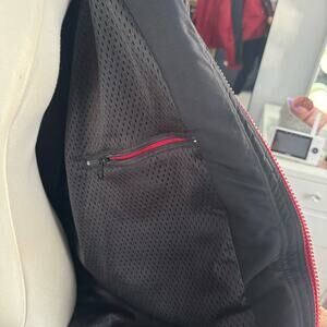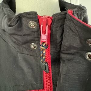 5 Generic Names: Red Black Jacket, Two-Tone Outerwear, High Collar Coat, Logo Patch Jacket, Button-Up Outer Layer