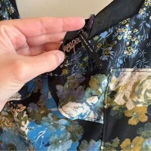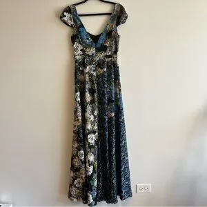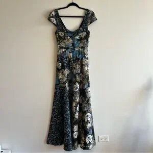 Blue, floral maxi dress from Free People. Has bodice details, and little cap sleeves. Zips up the back. Would be a perfect wedding guest dress! In great condition, no flaws to note. All measurements are approximate and taken with the item laid flat.