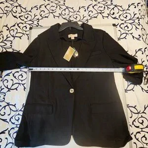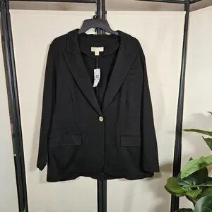 NWT Michael Kors Black One Button Blazer Size 1X. This Blazer is not lined and has 2 pockets in front. Please see pictures for more details. If you have any questions or would like more details, please do not hesitate to ask. All measurements are approximate. Non smoking home. We do have a dog. I will drop off for shipping next day, Monday through Saturday. If you purchase on Saturday or Sunday, I will ship on Monday (If the post office is closed for a holiday, I will ship the following day). I welcome all offers, I will either accept or I will respond back with my best offer. Thank you for looking!