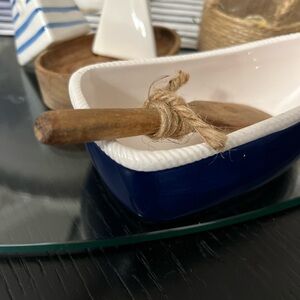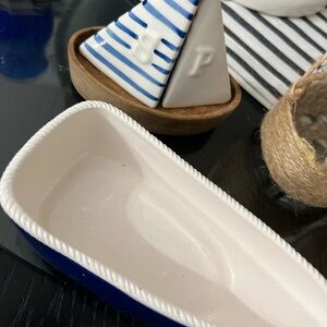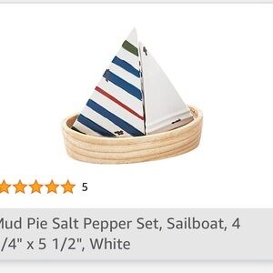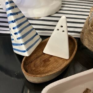 These are the cutest set together. Both from Pier 1 set including: 3-pc salt and pepper shakers and bamboo wood base. 2- pc Stoneware striped boat with bamboo oar. Dishwasher and microwave safe. Used for staging homes. Selling as a set. Pictures of similar products and same measurements for both items. Thanks for looking:)