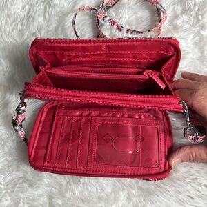 Vera Bradley pink floral wallet on a string. 2 zipper sections with lots of pockets and card slots with an adjustable shoulder strap. It has a magnetic outside pocket, measures about 7”x 4.5” x 2” in great pre-owned condition.