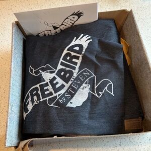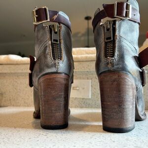 Pre-loved ankle bootie by Freebird by Steven. Baxter distressed grey. Size 9. Leather upper, leather lining, leather sole. Made in Mexico.