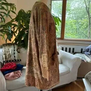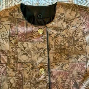 Vintage 1980’s EUGENE OF AUSTRALIA printed-leather jacket is a buttery-soft leather print that is tobacco, brown and brick colors in a fabulous conversational print design. Has gold buttons and is fully lined and front pockets. Very cool style and fits like a size 12. It seems in very good condition and was purchased in Australia in the 80’s. The length is 32” from center back neckline to hem. And the chest across front is 22-1/2” flat from 1” under AH straight across to 1” under AH. Really great eighties jacket in a gorgeous and soft leather! Thanks.