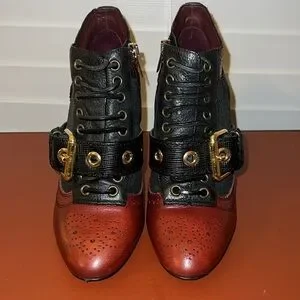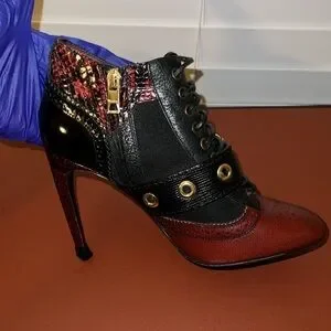 Very good used condition. Normal wear and tear. Burgundy/Black Leather and Python Embossed Gold tone boots. Minor scratches on hardware. Heel caps still in good shape. Zippers work properly on both boots. Laces in excellent condition. 4in heel. Runs closer to a size 8. No box included. Will ship in generic dust bag. Please look at all photos.